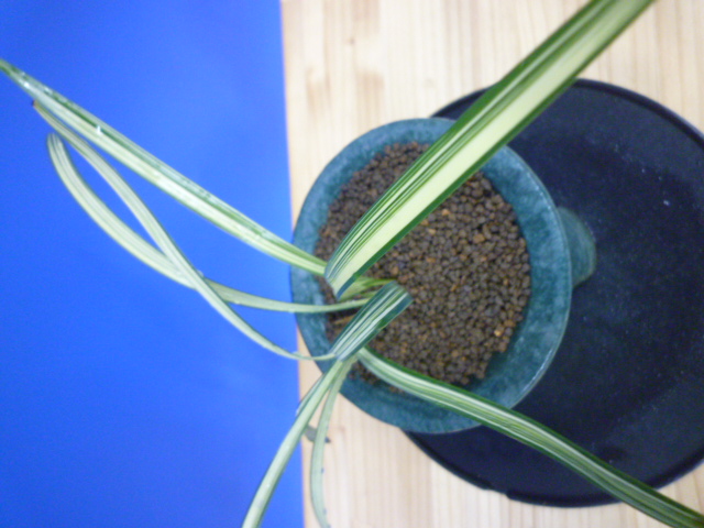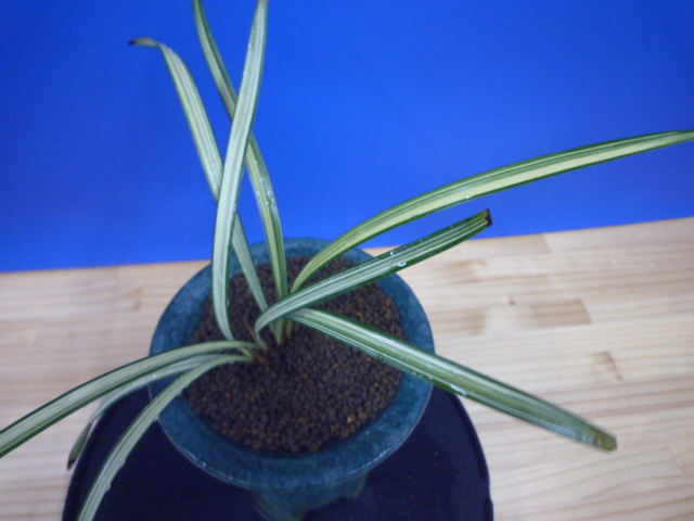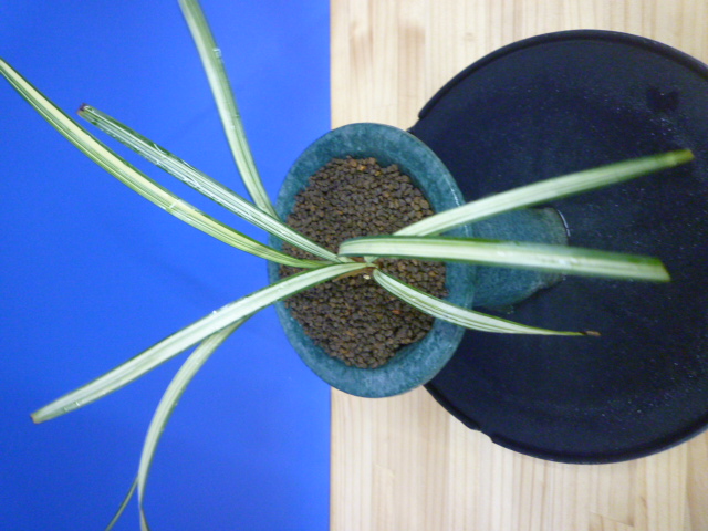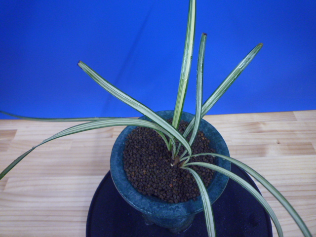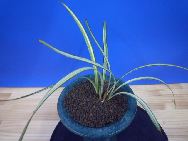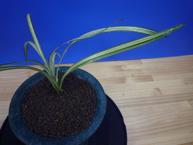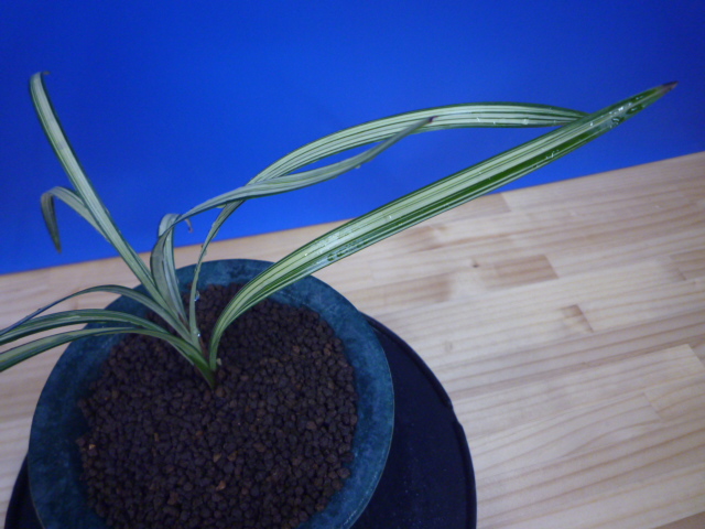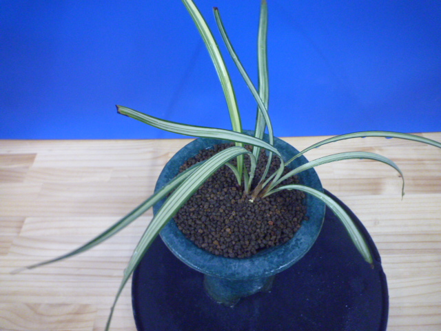 南極は、宮崎県産の垂れ葉が特徴的な縞で、花も縞花という大変魅力的な一品です。展示会でも評価が高く、良く大臣賞・金賞を獲得してきましたし、これからもこの人気は変わらないでしょう。柄物の中では比較的作り易い品種ですので、作が楽しめますのでお勧めです。