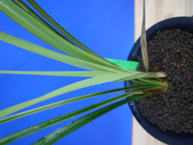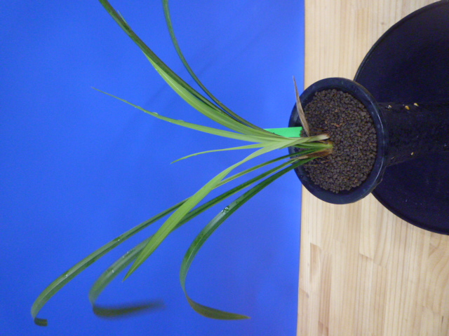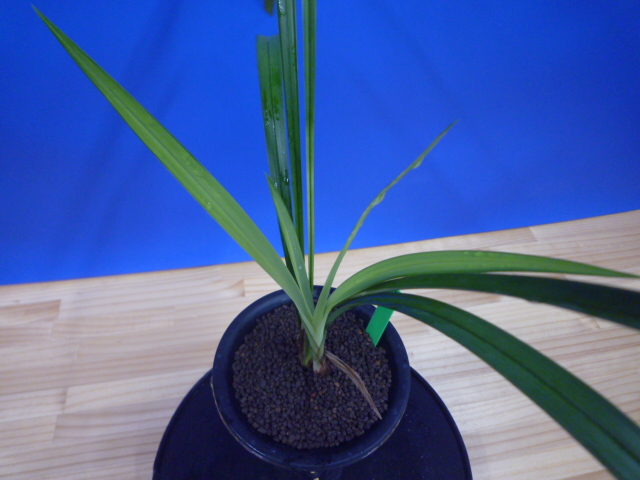 荒城の月は、高知県産の紺覆輪で花も黄色紺覆輪の大きなベタ舌系です。花軸の伸びが良く、花間をとるバランスの良い花です。展示会でも良く金賞を獲る品種で、葉芸品ながら作り易い所も魅力です。新芽は紺覆輪で上がり、後にも残りますので花がない時期でも楽しめます。