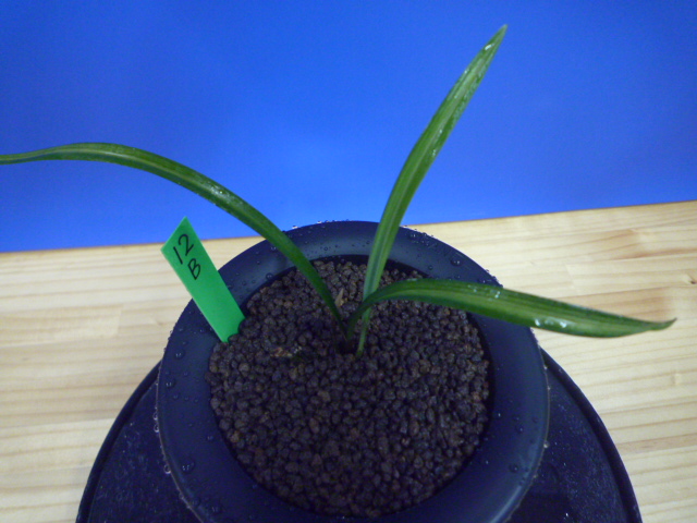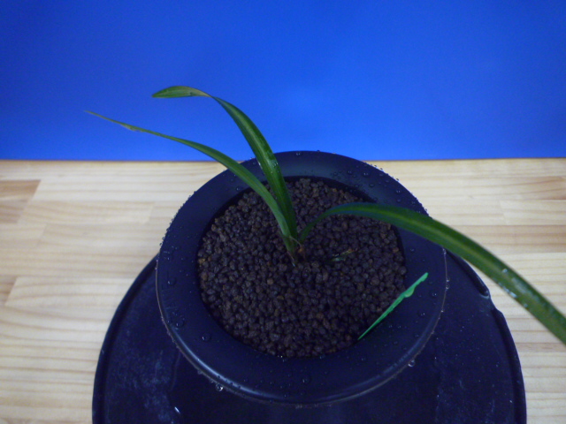 無名の柄です。1本立に新芽が上がっています。1枚葉ですが、新芽にもうっすら柄が出ています。根も綺麗にのびていますので、ここからの変化に期待してじっくり作ってみてください。まだまだ地味ですが、作りやすい品種ですので柄づくりを楽しみながら作ってください。