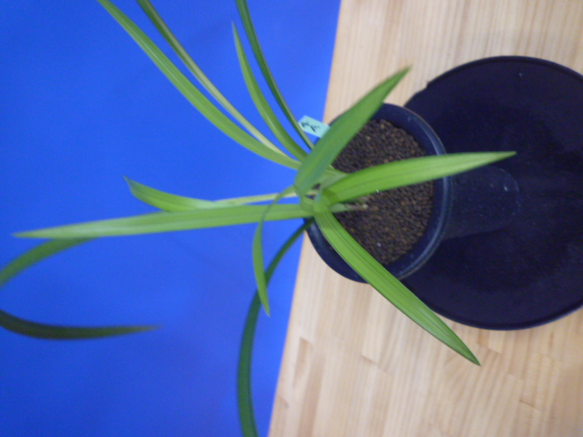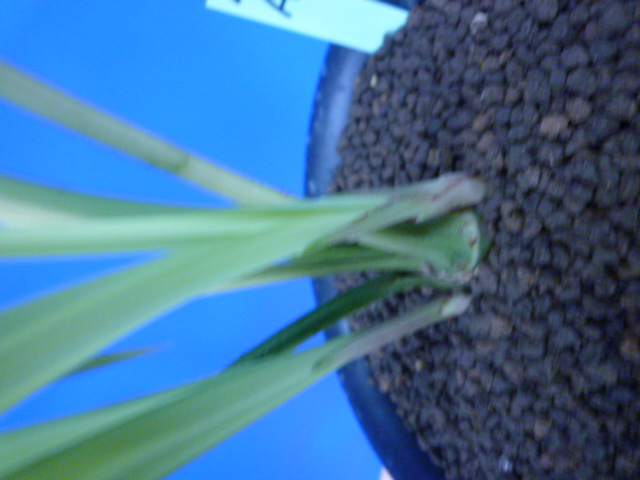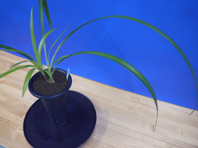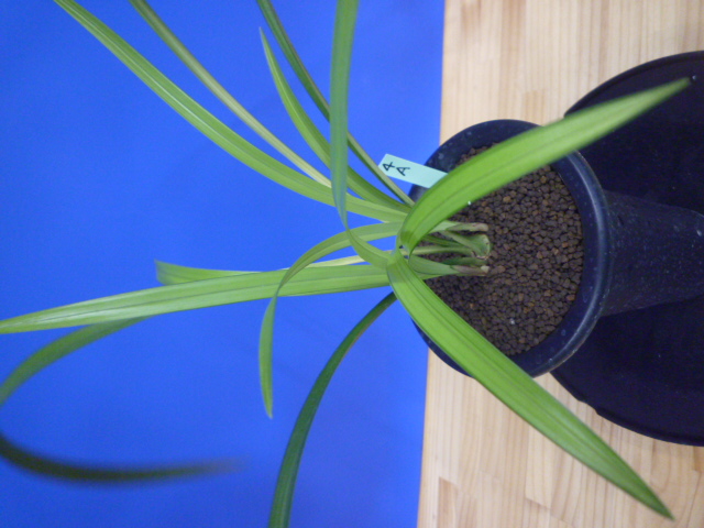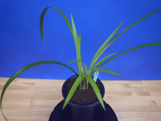 荒城の月は、高知県産の紺覆輪で花も黄色紺覆輪の大きなベタ舌系です。花軸の伸びが良く、花間をとるバランスの良い花です。展示会でも良く金賞を獲る品種で、葉芸品ながら作り易い所も魅力です。新芽は紺覆輪で上がり、後にも残りますので花がない時期でも楽しめます。
