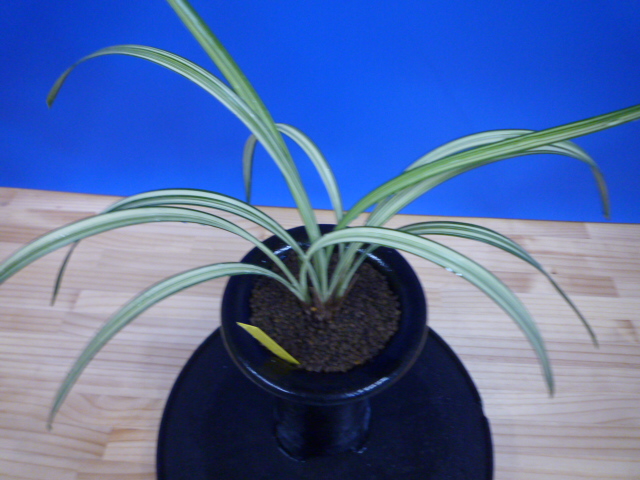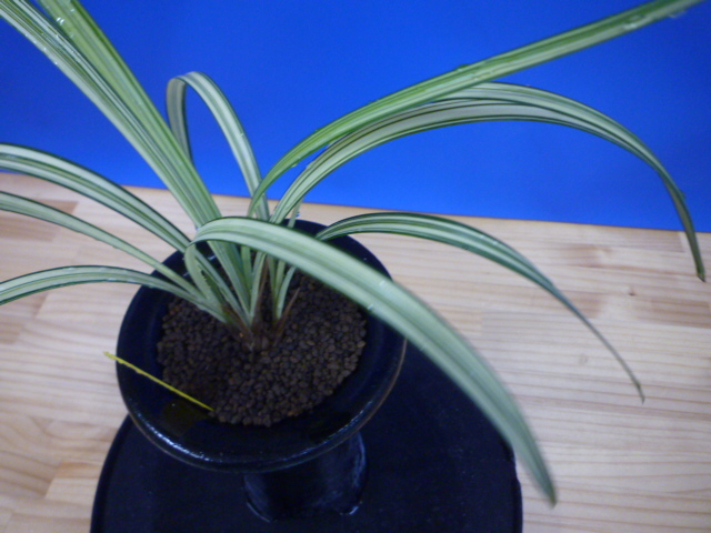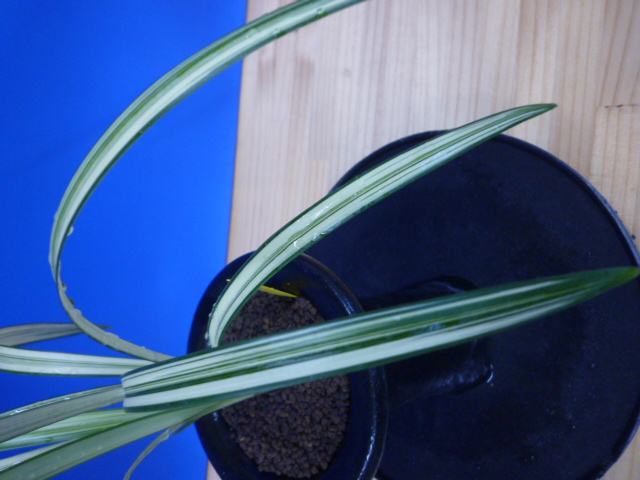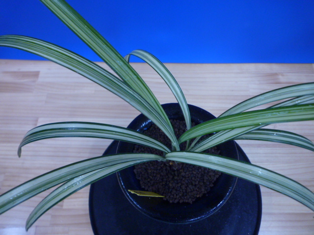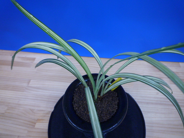 南極は、宮崎県産の垂れ葉が特徴的な縞で、花も縞花という大変魅力的な一品です。展示会でも評価が高く、良く大臣賞・金賞を獲得してきましたし、これからもこの人気は変わらないでしょう。柄物の中では比較的作り易い品種ですので、作が楽しめますのでお勧めです。