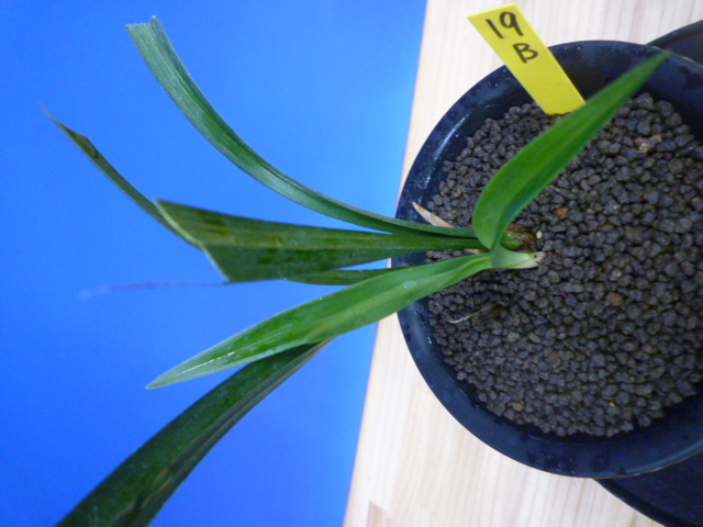 雫は、高知県産の花弁の厚い青チャボで、舌は大きく無点系です。大きな舌は堅く巻きにくく、花軸の伸び・花数も良好です。無点系ですが舌点は環境や状態によって出ることもありますが、大変良いチャボ花を咲かせてくれます。舌が大きく花形が良いチャボ花は、存在感があります。