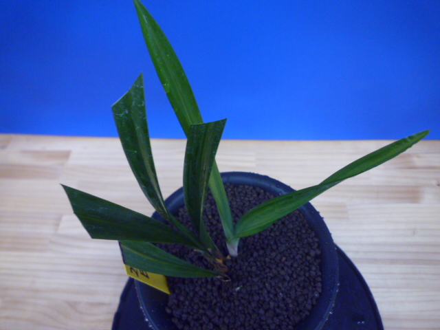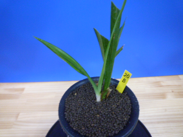 阿波武蔵は、交配種で更紗梅弁の三角咲きで、大きく丸い舌に紫紅色がベタ風に入る平成20年に土佐愛蘭会に登録された品種です。チャボ花ですが、花軸の伸びも良く、花間・花数も良好な大変人気の高い一品です。葉も葉肉がある広葉で硬く、大変魅力的なチャボ木です。
