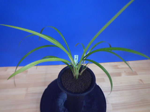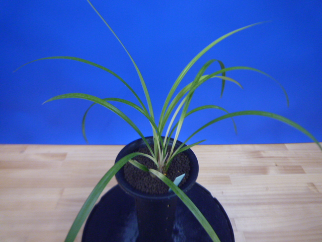 荒城の月は、高知県産の紺覆輪で花も黄色紺覆輪の大きなベタ舌系です。花軸の伸びが良く、花間をとるバランスの良い花です。展示会でも良く金賞を獲る品種で、葉芸品ながら作り易い所も魅力です。新芽は紺覆輪で上がり、後にも残りますので花がない時期でも楽しめます。
