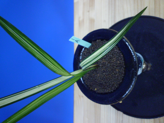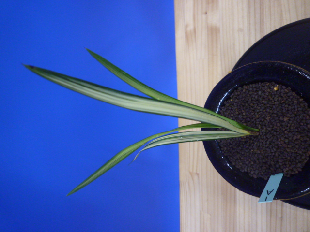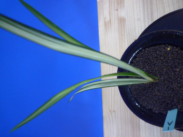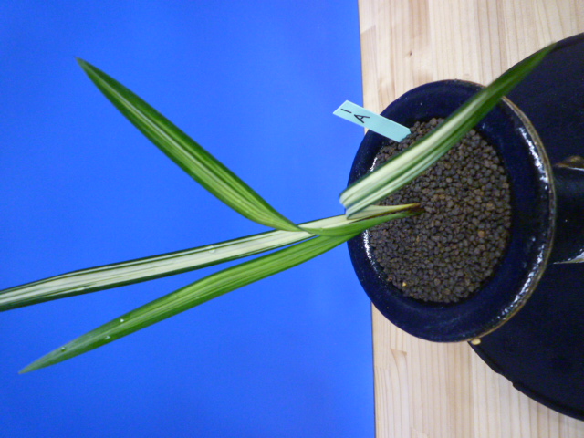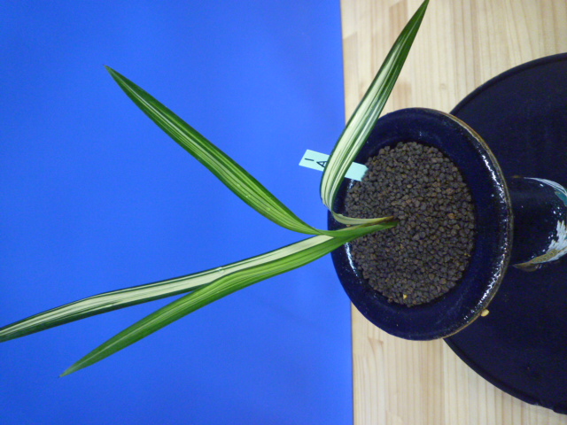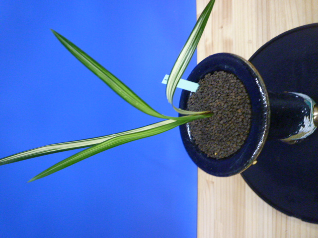 縄文錦は、鹿児島県屋久島産の紺覆輪中透縞でチャボ性である最高級の柄物です。30年以上前に屋久島で採取されたホルモン付きの1本立を作り上げ登録した逸品です。ただの柄物ではなく、チャボ性で葉に厚みと硬さがあることで縄文錦がより特別な柄物になっています。 露受けの葉を交えることで葉姿が上品に仕上がります。紺地が深く黄中透縞とのコントラストが最高です。