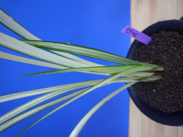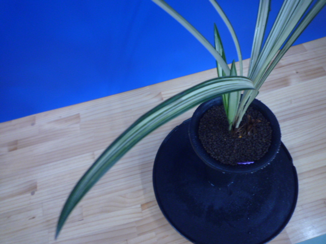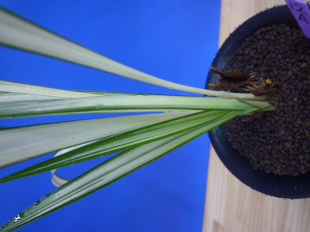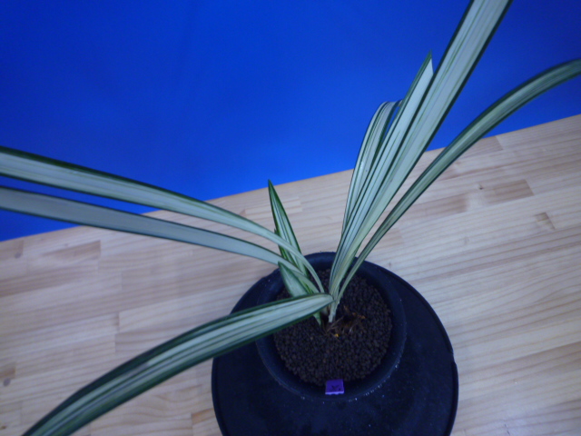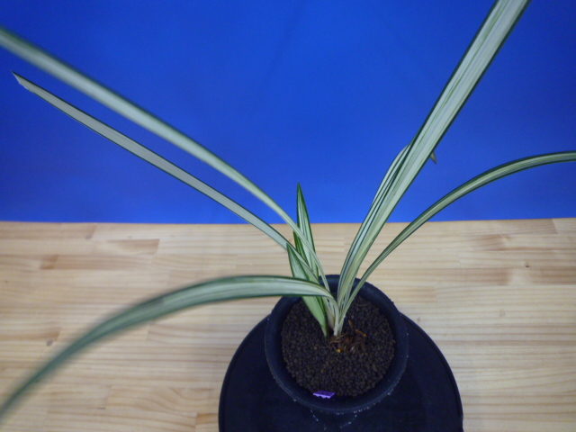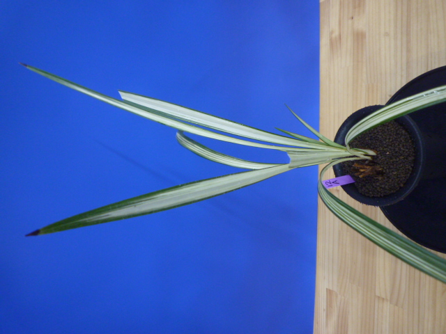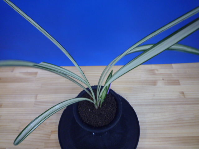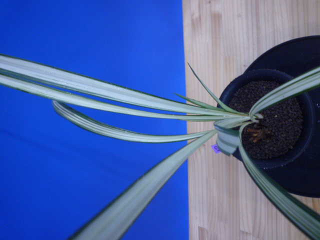 緑宝は、高知県産の紺覆輪純白中斑芸の葉芸品で、昔から大変人気の高い一品です。作り易く、初めての方にもおすすめです。展示会ではよく金賞を獲る品種ですので、柄良し、花良しの名品です。柄の変化が多彩で、良い柄を出す楽しみがある王道の柄物です。