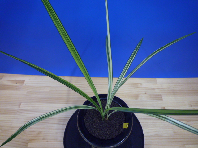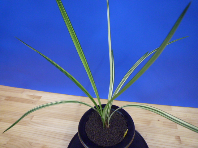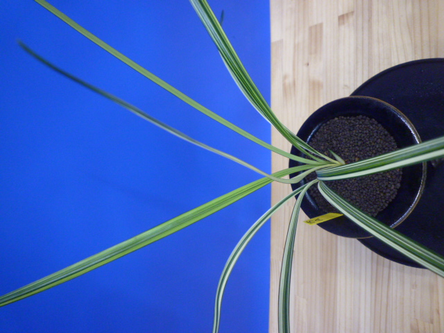 天寿は、宮崎県産の紺覆輪中透け縞の柄物で、紺地が深く、中透とのコントラストが美しい最も人気がある高い葉芸品の一つです。柄性が良く葉姿にも品があり、いつみても惚れ惚れする最高品種の一つです。柄において抜群の安定感があり、一度は作りあげてみたい逸品です。