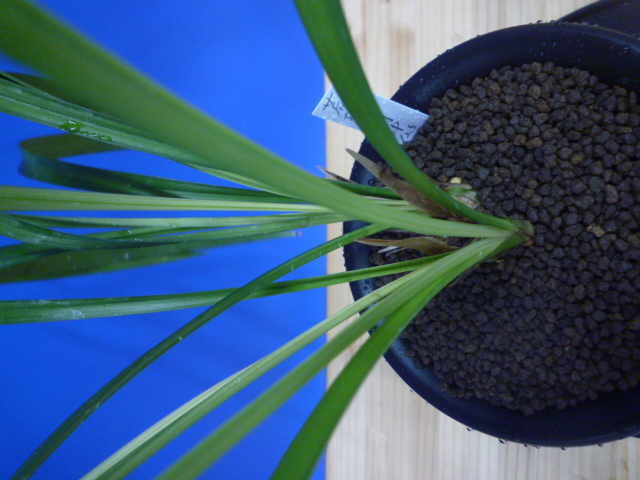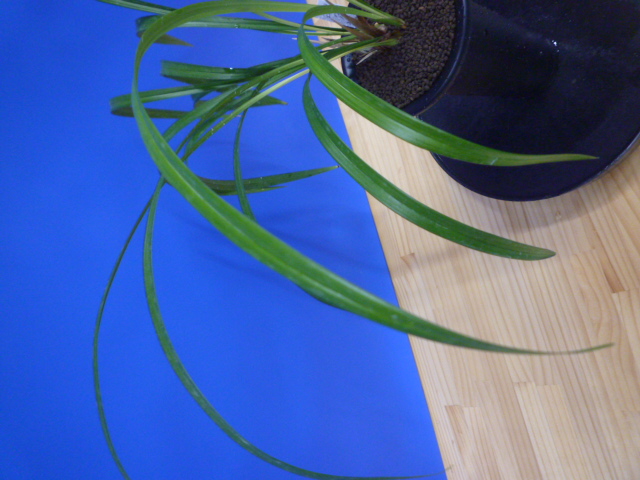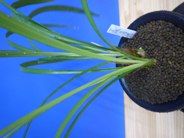 荒城の月は、高知県産の紺覆輪で花も黄色紺覆輪の大きなベタ舌系です。花軸の伸びが良く、花間をとるバランスの良い花です。展示会でも良く金賞を獲る品種で、葉芸品ながら作り易さも魅力です。新芽は紺覆輪で上がり、後にも残りますので花がない時期でも楽しめます。