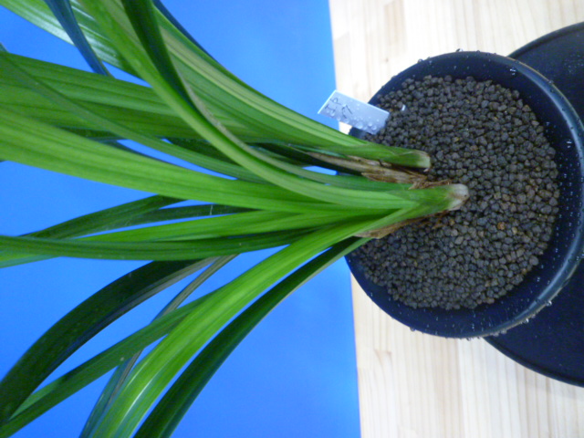 黒鈴は、高知県産の青花で三角を少し上げる平肩の梅弁咲きで、舌は大きく丸く黒いベタ舌が特徴の花です。葉は、中垂れの広葉です。平成26年に登録された品種で、花弁のしっかりした花で、花間が良く、花数も程よい品種で、将来有望品です。