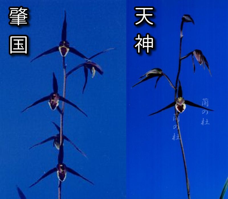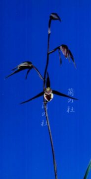 肇国は、人気の高知県の黒花です。花軸の伸びが良く花間をとり、舌は舟底の大きい迫力のある花です。花弁もしっかりしている花で、型崩れしにくい所も魅力的です。これまでに多くの展示会で総合優勝を飾るなどその実力は折り紙つきです。一度は花を咲かせていただきたい名品です。