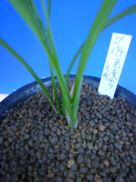 先刷毛です。通常よりも白い先刷毛が入り、どんな花が咲くのか楽しみな一品です。私はまだ花を咲かせていませんが、桃無点系の花が咲くと聞いていますので、期待して作ってみてはいかがでしょうか。あまりない先刷毛のタイプだと思いますので、おすすめいたします。3本立の中木に葉切れが3本ついています。