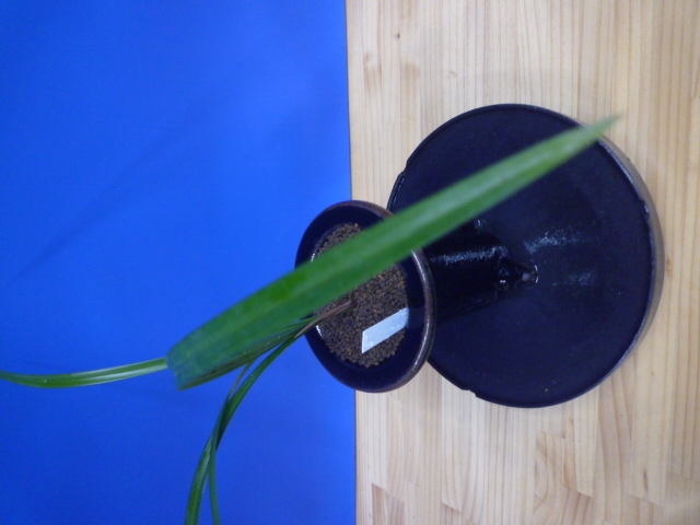 京の夢の交配から咲いた濃紅大輪大舌無点系です。発色の良い紅花で、平肩に近い三角咲きで花形も良い大輪花です。大きな舌は幅があり、無点系で魅力的です。花軸からのびる子房も長く、空間美があります。大変良い紅花ですので、これからの花を楽しみにしてください。