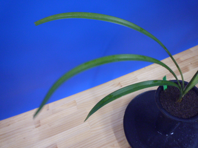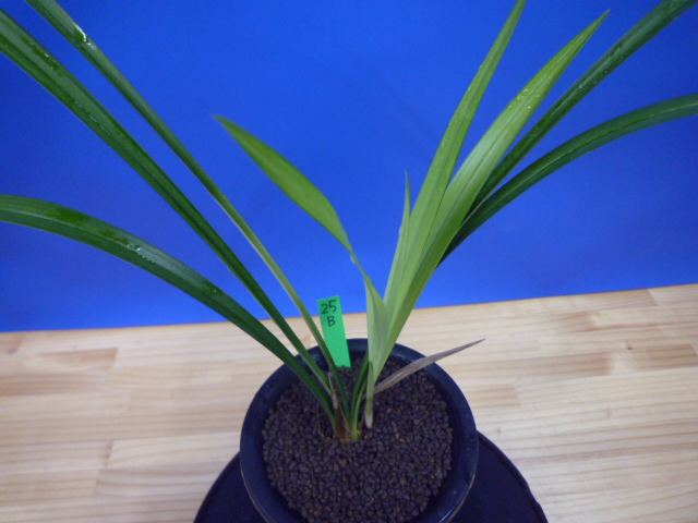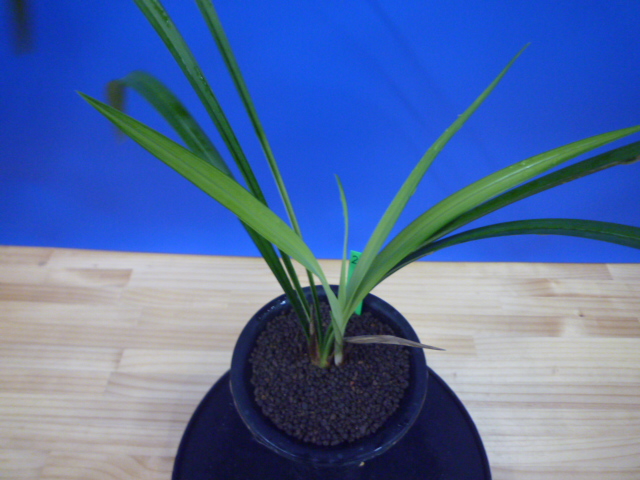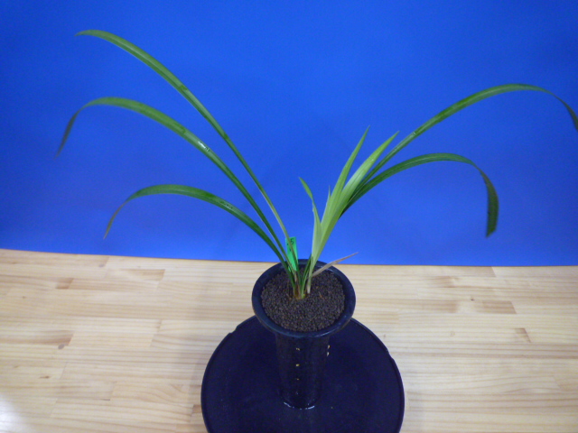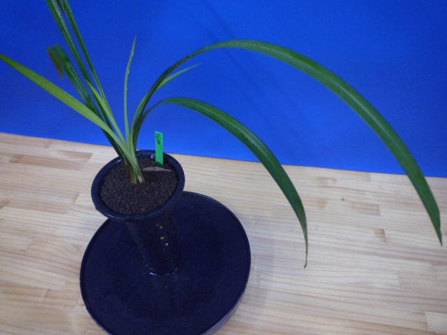 荒城の月は、高知県産の紺覆輪で花も黄色紺覆輪の大きなベタ舌系です。花軸の伸びが良く、花間をとるバランスの良い花です。展示会でも良く金賞を獲る品種で、葉芸品ながら作り易い所も魅力です。新芽は紺覆輪で上がり、後にも残りますので花がない時期でも楽しめます。