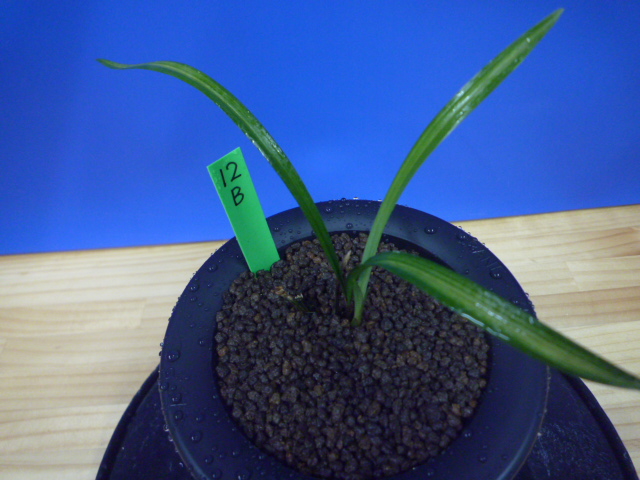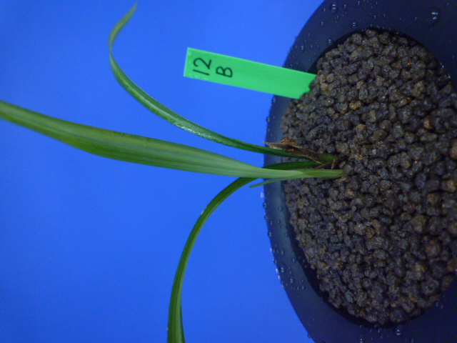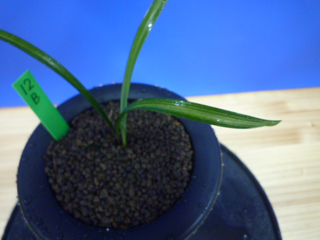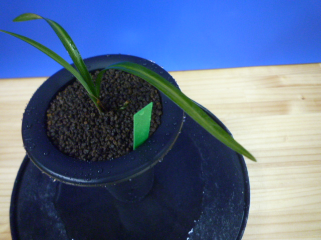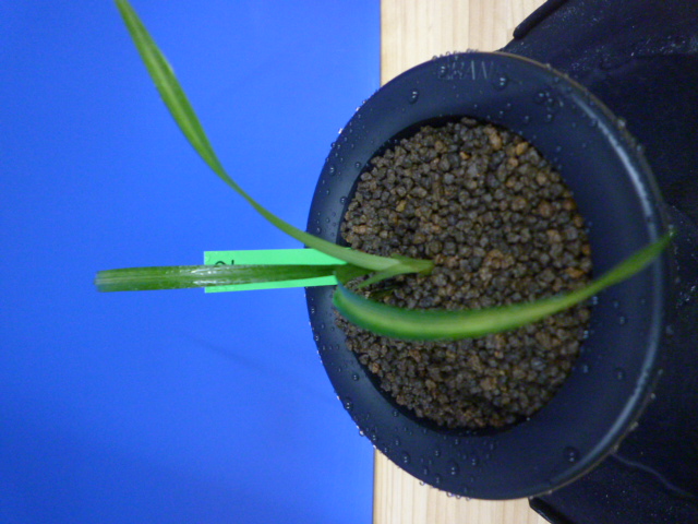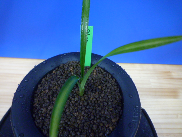 無名の柄です。1本立に新芽が上がっています。1枚葉ですが、新芽にもうっすら柄が出ています。根も綺麗にのびていますので、ここからの変化に期待してじっくり作ってみてください。まだまだ地味ですが、作りやすい品種ですので柄づくりを楽しみながら作ってください。