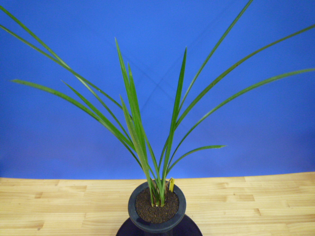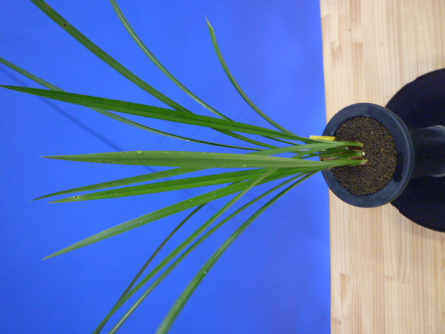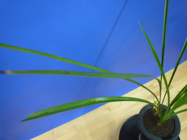 白福は、鹿児島県産の白花の素舌無点です。花弁や舌がしっかりしていて、型崩れが少なく舌も巻きにくい大変良い白花です。花軸の伸びは良いですが立ち葉ですので完全に抜け切ることは難しいですが、花間・花数の良好でバランスは良いです。昔から展示会でも大変人気が高い品種ですが、最近は数が少なく減ってきているようです。