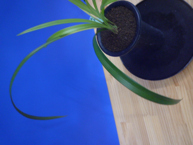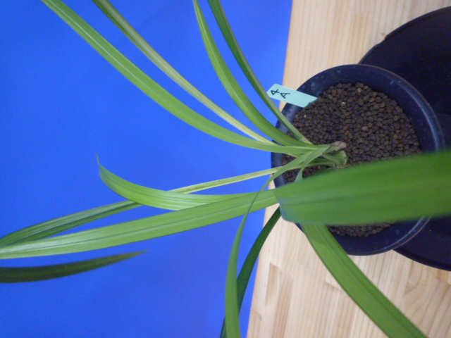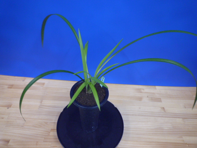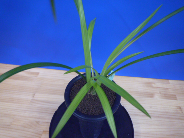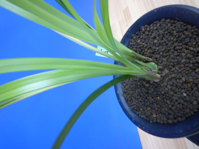 荒城の月は、高知県産の紺覆輪で花も黄色紺覆輪の大きなベタ舌系です。花軸の伸びが良く、花間をとるバランスの良い花です。展示会でも良く金賞を獲る品種で、葉芸品ながら作り易い所も魅力です。新芽は紺覆輪で上がり、後にも残りますので花がない時期でも楽しめます。