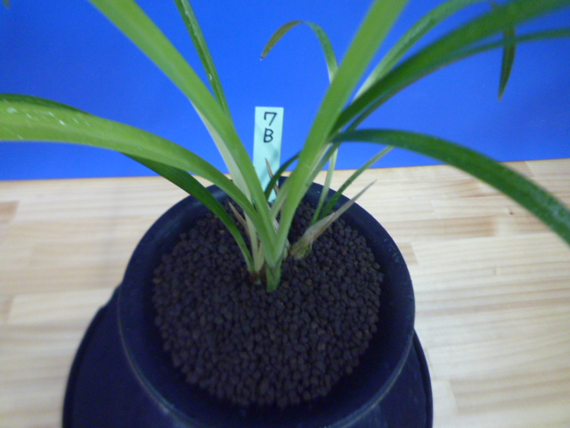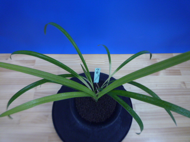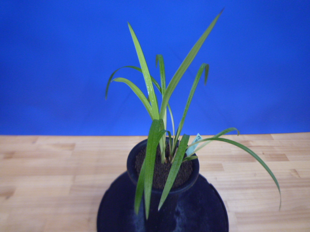 荒城の月は、高知県産の紺覆輪で花も黄色紺覆輪の大きなベタ舌系です。花軸の伸びが良く、花間をとるバランスの良い花です。展示会でも良く金賞を獲る品種で、葉芸品ながら作り易い所も魅力です。新芽は紺覆輪で上がり、後にも残りますので花がない時期でも楽しめます。