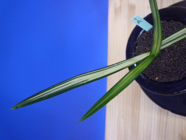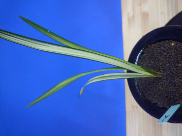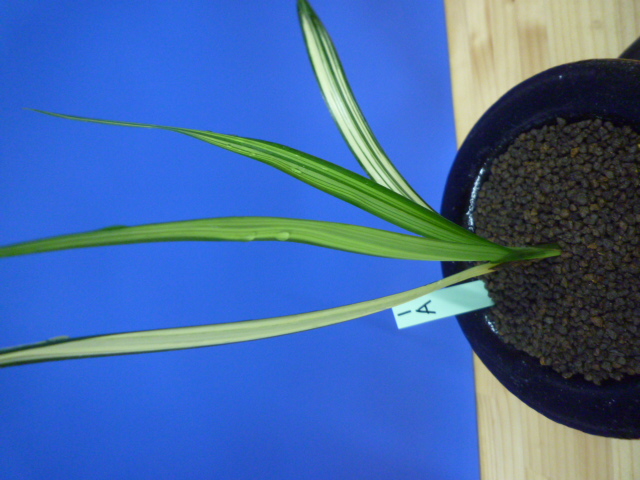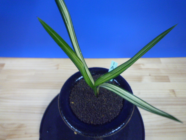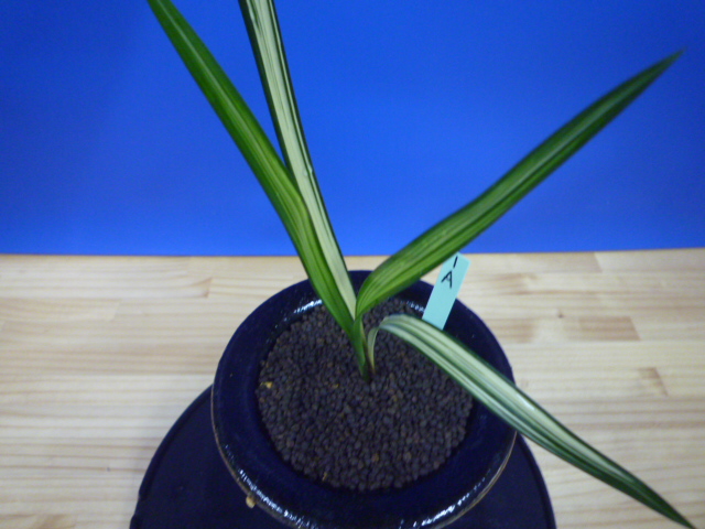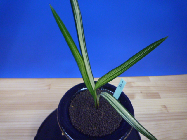 縄文錦は、鹿児島県屋久島産の紺覆輪中透縞でチャボ性である最高級の柄物です。30年以上前に屋久島で採取されたホルモン付きの1本立を作り上げ登録した逸品です。ただの柄物ではなく、チャボ性で葉に厚みと硬さがあることで縄文錦がより特別な柄物になっています。 露受けの葉を交えることで葉姿が上品に仕上がります。紺地が深く黄中透縞とのコントラストが最高です。