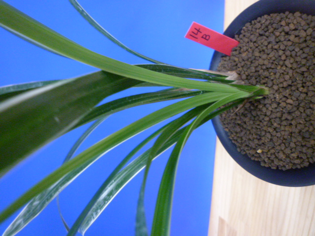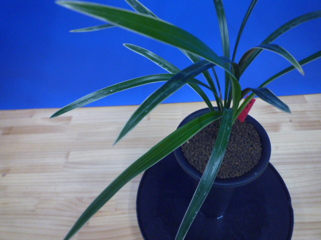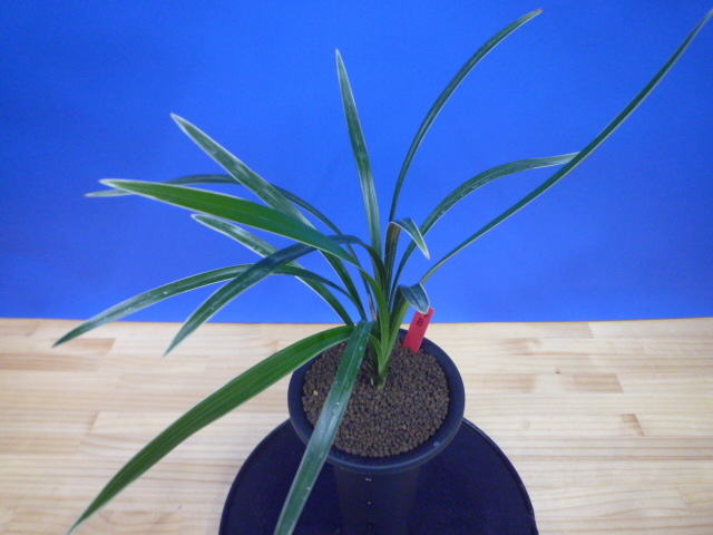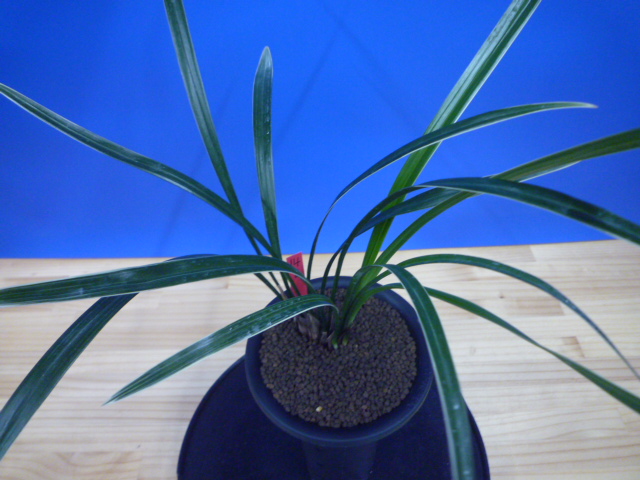 慎太郎は、高知県産の「帝王」の坪取れです。型の良い紅花の丸舌で、葉には覆輪を掛けます。高知県の展示会でも優勝したことのある花で、花弁が厚く、花軸の伸びも良く花間もしっかりとる魅力的な花です。作り易い品種で、花持ちも良くじっくり楽しめます。
