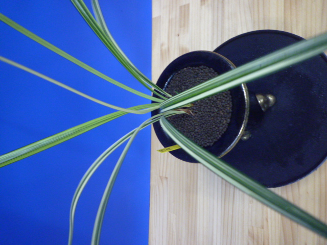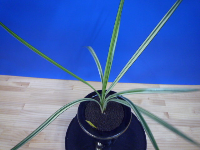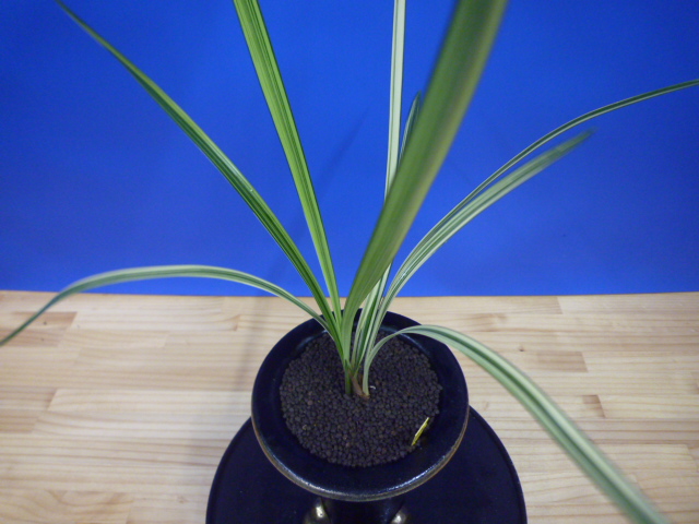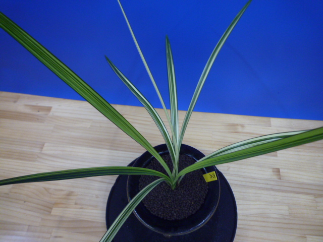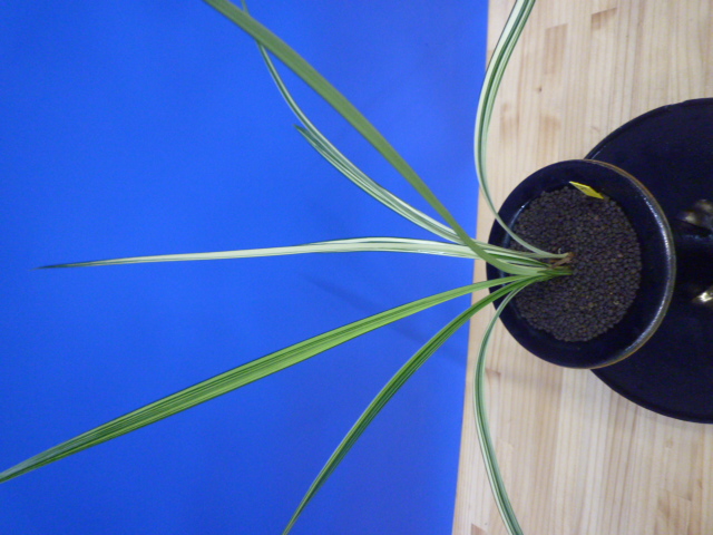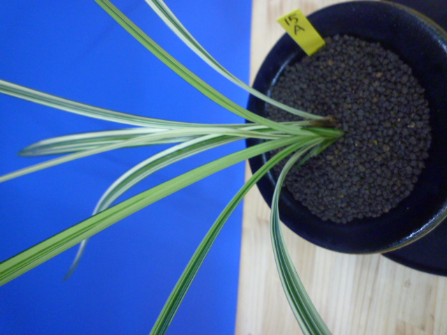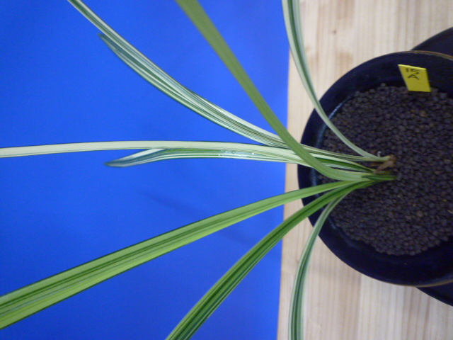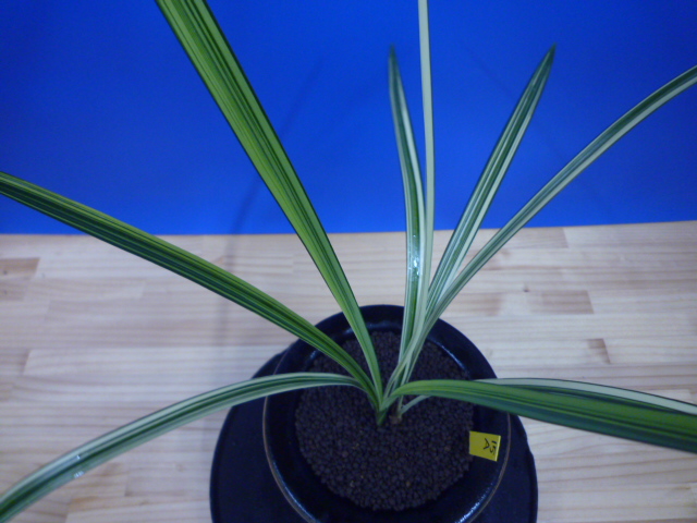 天寿は、宮崎県産の紺覆輪中透け縞の柄物で、紺地が深く、中透とのコントラストが美しい最も人気がある高い葉芸品の一つです。柄性が良く葉姿にも品があり、いつみても惚れ惚れする最高品種の一つです。柄において抜群の安定感があり、一度は作りあげてみたい逸品です。