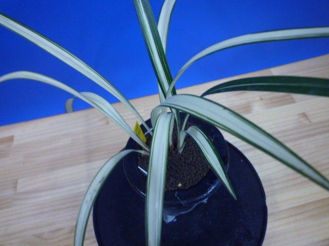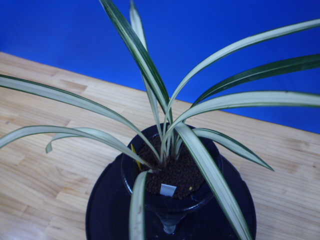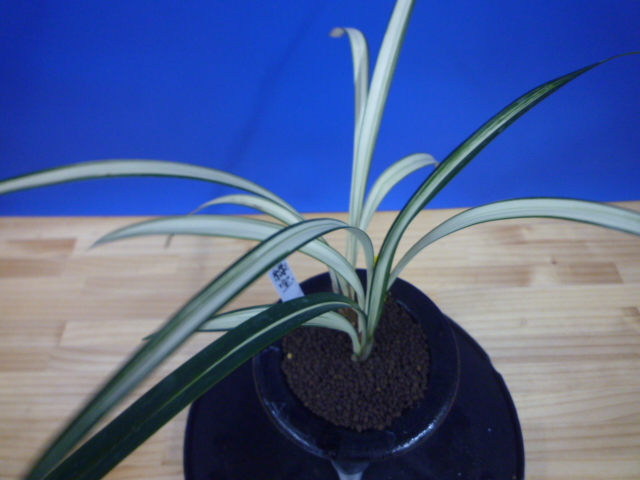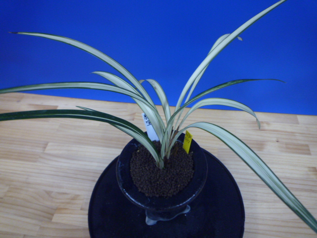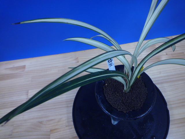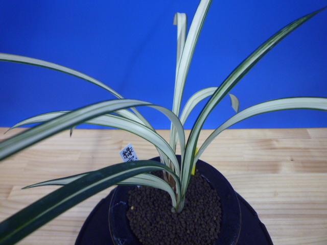 緑宝は、高知県産の紺覆輪純白中斑芸の葉芸品で、昔から大変人気の高い一品です。作り易く、初めての方にもおすすめです。展示会ではよく金賞を獲る品種ですので、柄良し、花良しの名品です。柄の変化が多彩で、良い柄を出す楽しみがある王道の柄物です。