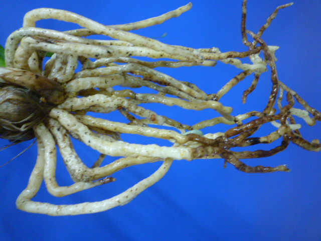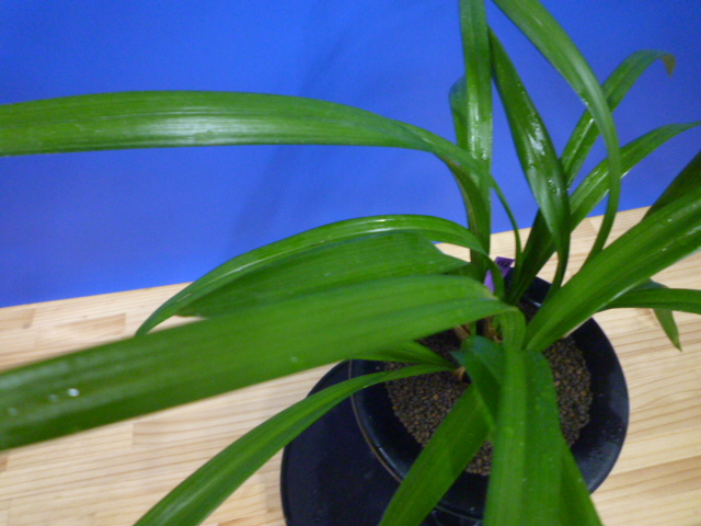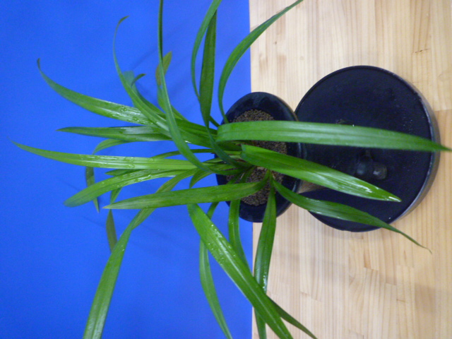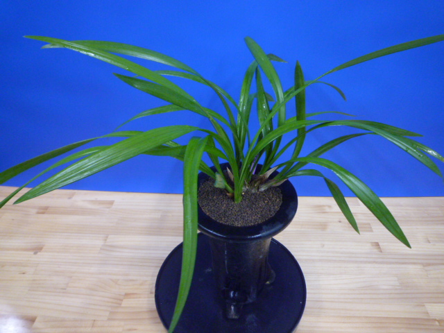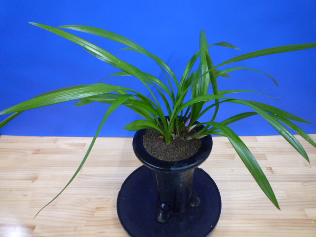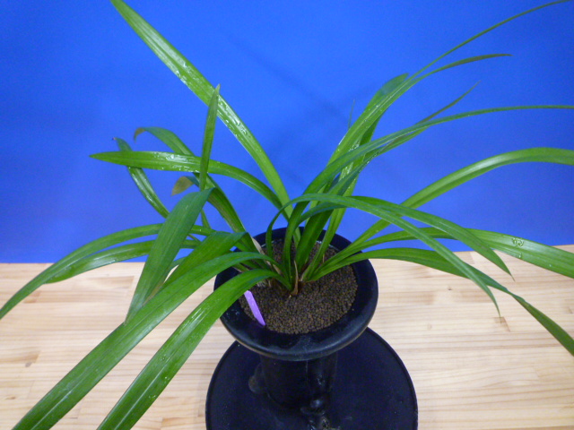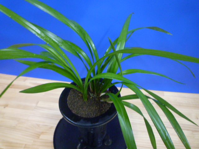 玉青冠は、交配種の花弁が広い厚弁の青花で舌も大きく魅力的な花です。花がしっかりしていて、花崩れが少なく内弁の押さえも良好ですので、じっくり花を楽しめます。中垂れ葉で花軸の伸びが良く、花間・花数ともに良く展示会でも大変優秀な成績をおさめてきました。木が大きくならずとも花を咲かせ、また咲かせた花は広弁で舌が大きく豪快な感じでとても迫力があって良く見えます。
