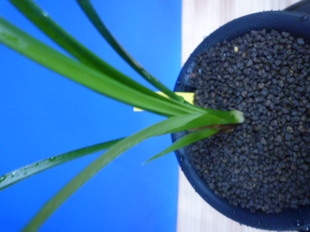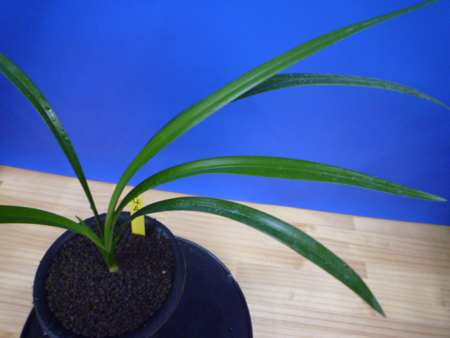 色変わり系の黄花無点系です。金鵄系の黄花ですので、大変色がきれいで発色も良くきれいな色で咲きました。画像の花は初花で宮崎の平野部で咲かせてこの色で咲きました。初花以来何度か花を咲かせてきましたが、画像のような花で咲いたり、柄花のように咲いたりと多彩な花色の変化があり、そこに魅力を感じました。花色の安定化も大事ですが、こういった特殊な色合いの花は、咲くタイミング、環境の変化で違った表情を見せてくれますので、長く楽しめます。花は大きくはありませんが、花形がよく、舌が無点系で清楚で気品があり見事です。