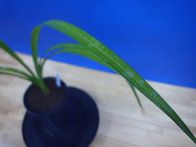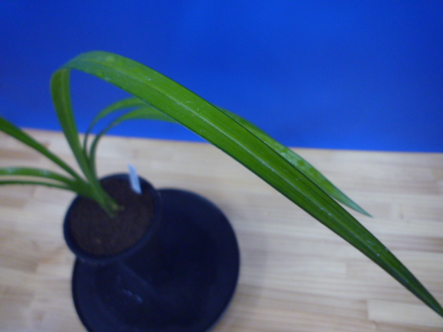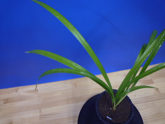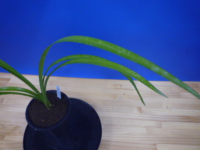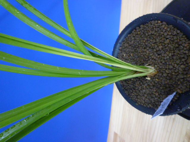 荒城の月は、高知県産の紺覆輪で花も黄色紺覆輪の大きなベタ舌系です。花軸の伸びが良く、花間をとるバランスの良い花です。展示会でも良く金賞を獲る品種で、葉芸品ながら作り易さも魅力です。新芽は紺覆輪で上がり、後にも残りますので花がない時期でも楽しめます。