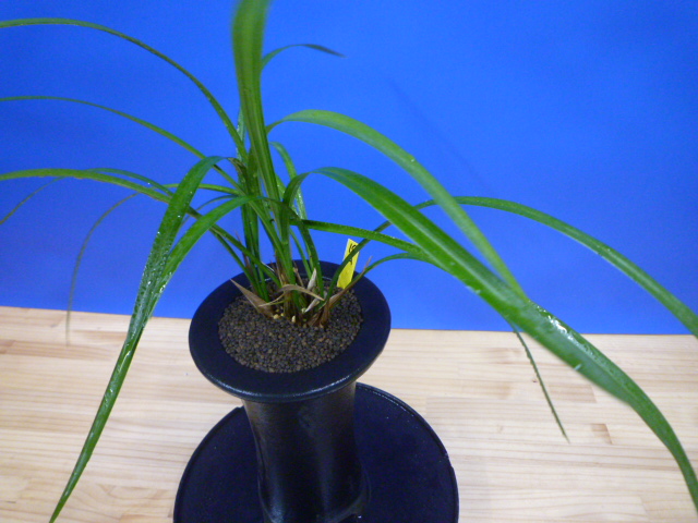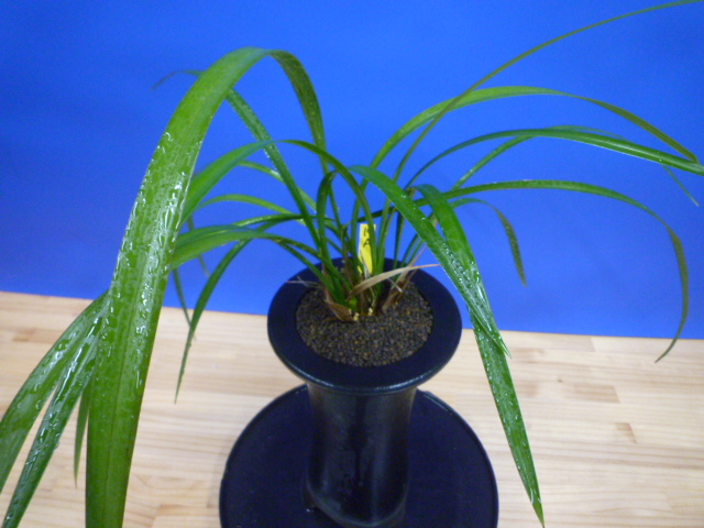 山見白宝は、一文字系の白花素心です。花弁の張りが良く、花形も良好でキレがあります。花軸の伸びはとても良く、葉上へしっかりと全体が抜け上がり、画像のように花間も十分です。花の大きさは今回の開花時で10㎝程でした。