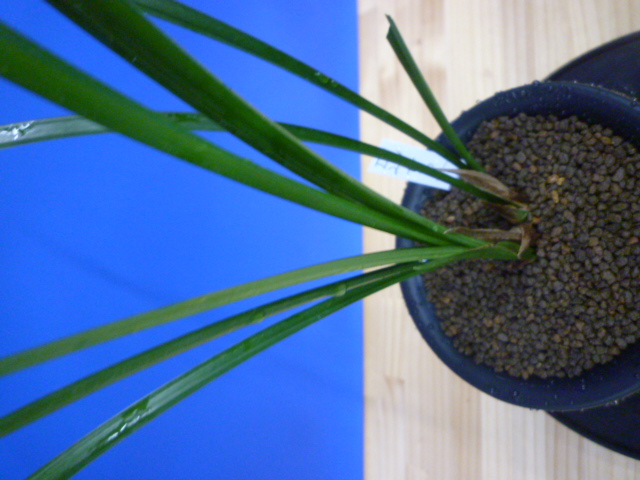 万里は、宮崎県産の青花のベタ舌です。花弁の中央に筋状に元から弁先に入るベタと同じ濃紫紅色はほかにはないこの花特有のポイントです。花軸の伸びが良く、葉上に抜け上がります。花弁に厚みがありしっかりした花で、型崩れの少ない優秀な花です。展示会でも大変人気があり、数の少ない珍品ですのでお勧めいたします。